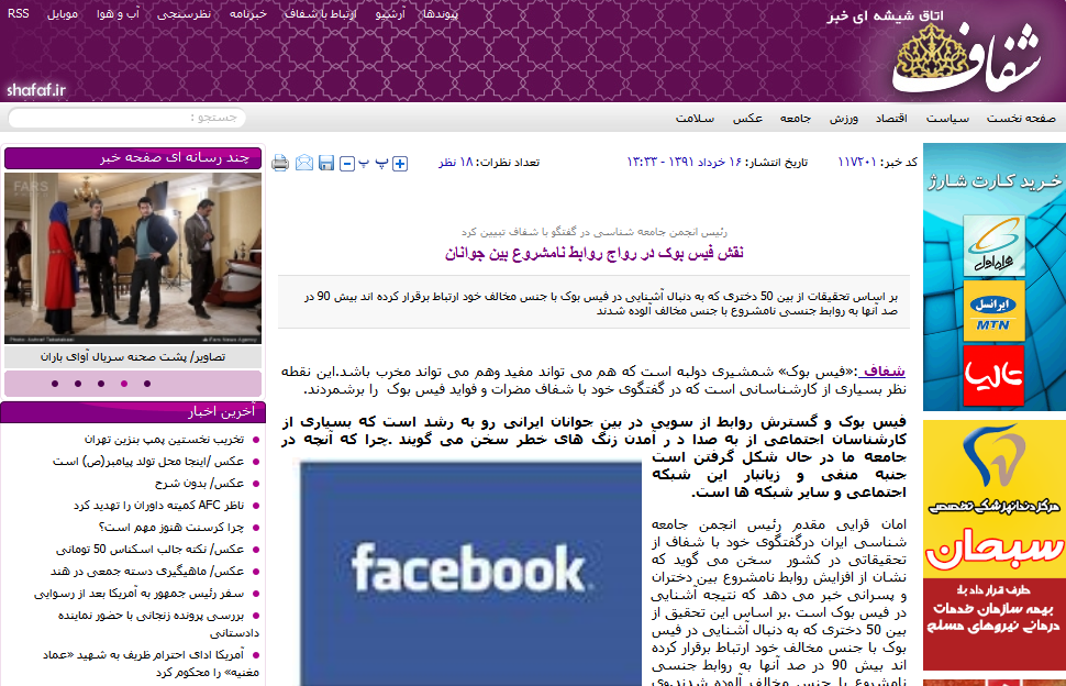 5- امان قرایی مقدم رئیس انجمن جامعه شناسی ایران درگفتگوی خود با شفاف از تحقیقاتی در کشور سخن می گوید که نشان از افزایش روابط نامشروع بین دختران و پسرانی خبر می دهد که نتیجه آشنایی در فیس بوک است .بر اساس این تحقیق از بین 50 دختری که به دنبال آشنایی در فیس بوک با جنس مخالف خود ارتباط برقرار کرده اند بیش 90 در صد آنها به روابط جنسی نامشروع با جنس مخالف آلوده شدند.وی تاثیرات مخرب این شبکه های اجتماعی را در حدی می داند که می تواند منجر به فروپاشی بنیان خانواده شود. منبع: سایت شفاف 91/3/16